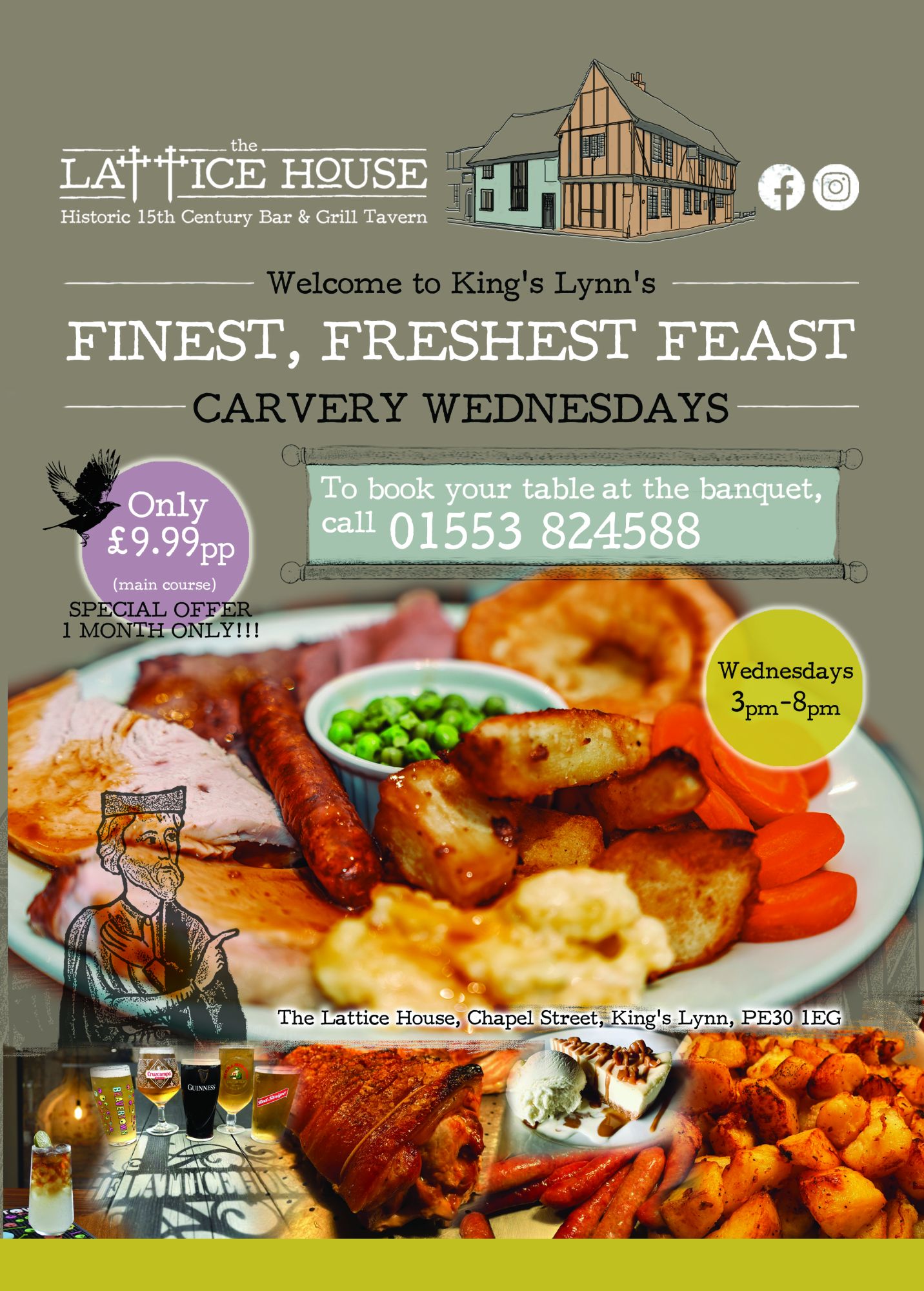 From 3pm - 8pm we are bringing our popular carvery to Wednesdays and for a limited period only for the amazing price of £9.99. (Dessert not included).